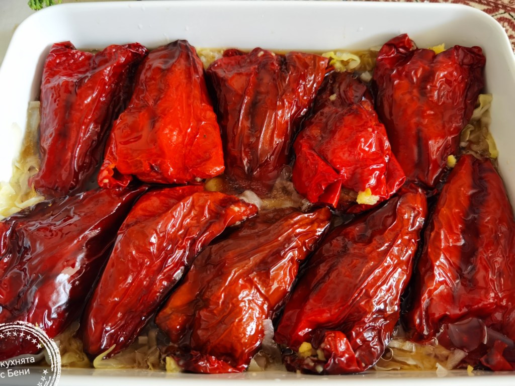 Тавата, в която ще пека чушките намазах леко с олио и покрих със зелевите листа, които бяха тънки и нежни. Вече набъбналите чушки отцедих и запасих водата, в която престояха. Всяка чушка напълних със сместа, без да я препълвам и я поставих в тавата. Имах още два зелеви листа, които нарязан на дребно и сложих на няколко места около чушките. Полях ги с 2 ч.ч. /500 мл./ от водата, в която престояха чушките и ги покапах с малко олио. Тъй като съдът, в който пека е керамичен, го поставих в студена фурна, която включих на 180 градуса. 10 минути, след като ястието завря, покрих тавата с алуминиево фолио и пекох около 20 минути. След това внимателно обърнах чушките и пекох под фолио още около 15 минути или до видима готовност на чушките. Трябва лесно да се пробожда ципата им. Пека под фолио, защото така се задушават и омекват много повече. Обичам в тавата да остане малко сос, с малко от който да полея чушките при сервиране.