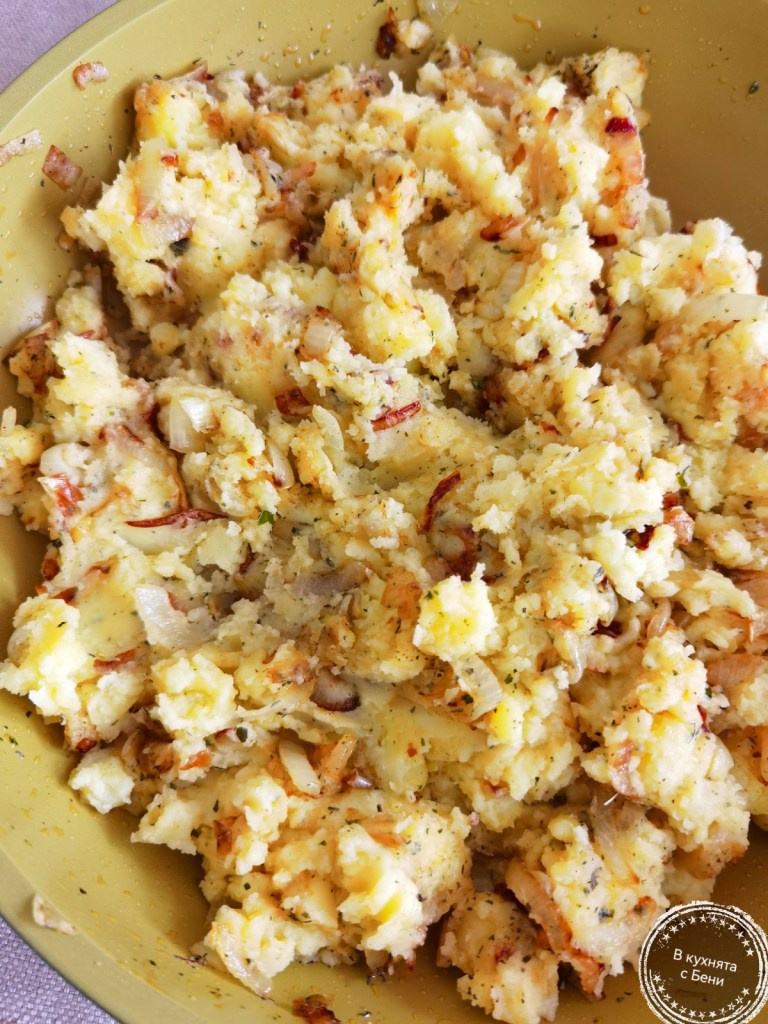 През това време обелих главите лук и ги нарязах на едро. В дълбок тиган загрях 4 с.л. олио и изпържих лука, като леко го посолих. Целя да добие леко карамелен цвят. Тогава добавих джоджена и червения пипер, разбърках за кратко и добавих добре сварените, отцедени и намачкани с вилица картофи. Тук е моментът да опитате сместа и ако е нужно да посолите още малко. Много ми е вкусна тази смес.
