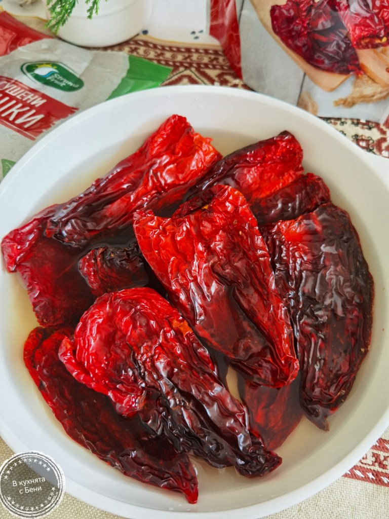 Сушените чушки накиснах в топла вода и оставих настрана.