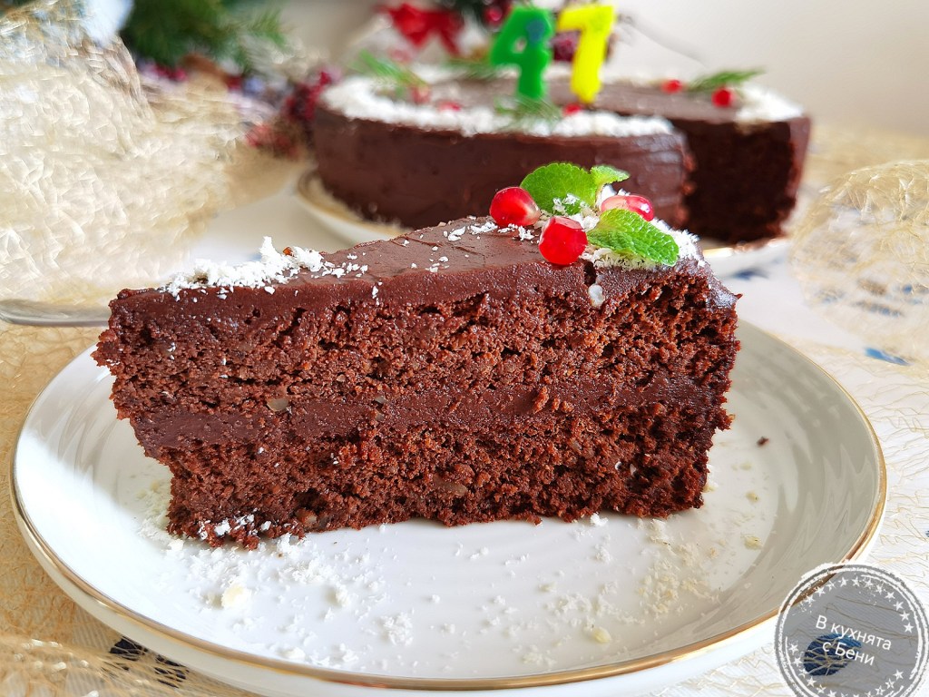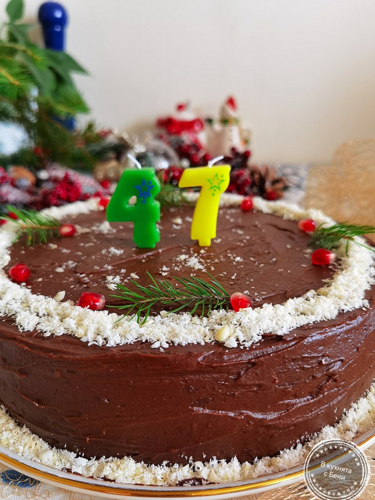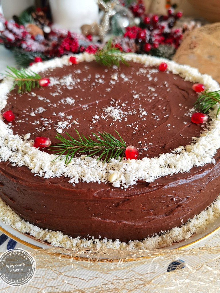 Украсих я със смлени бадеми и зрънца нар. Парчетата режа със затоплен нож. Важно е преди да разрежем тортата да я оставим да постои на стайна температура, след като бъде извадена от хадилника.