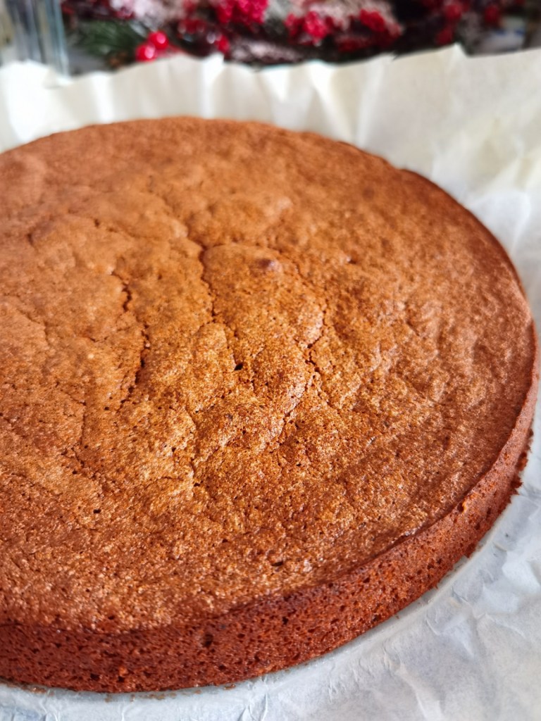 В чиния за торта разположих първия напълно изстинал блат и го намазах с малко повече от 1/3-та от крема. Покрих с втория блат и намазах отгоре и отстрани тортата. Покрих я със стъклен капак и прибрах в хладилника за през нощта.