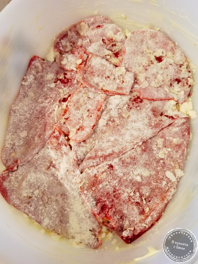 Дъното и стените на съд за печене с размери 26х21х9 см. намазах добре с 1 ч.л. меко масло. Брашното сложих в малка чиния. Всяка половинка чушка овалях в брашно от двете страни и изтупах излишното. Разположих един плътен ред чушки, които леко посолих. Сиренето натроших на дребно и разпределих върху чушките. Отгоре покрих с втори ред от набрашнени чушки и също леко посолих. В малка купа разбърках яйцата, млякото и щипка сол и равномерно полях ястието.