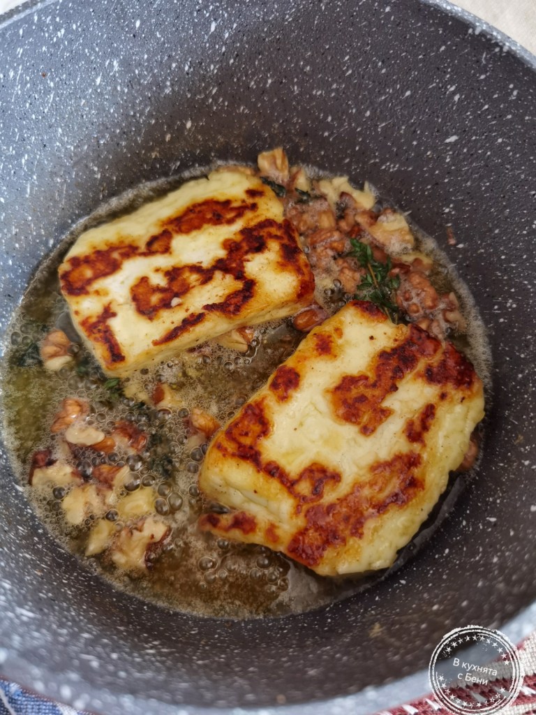 Сиренето разрязах на две еднакви половини. Ако е по-дебело, може и на три. В малък съд с незалепващо покритие загрях олиото, като степента на котлона бе 5 от 6 на моята печка. Сложих двете парчета сирене и ги готвих по около 2-3 минути на страна или до апетитен загар. Когато и от другата страна сиренето бе готово, добавих маслото, мащерката и ореховите ядки, като на няколко пъти обливах сиренето. След минута добавих меда и отново облях сиренето с получения сос. Сервирах го горещо, полято със сос и орехови ядки.