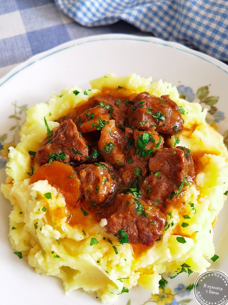 В чините за сервиране сложих „венец“ от картофено пюре и в средата добавих от месото и соса му. Поръсих с магданоз и поднесох с усмивка.