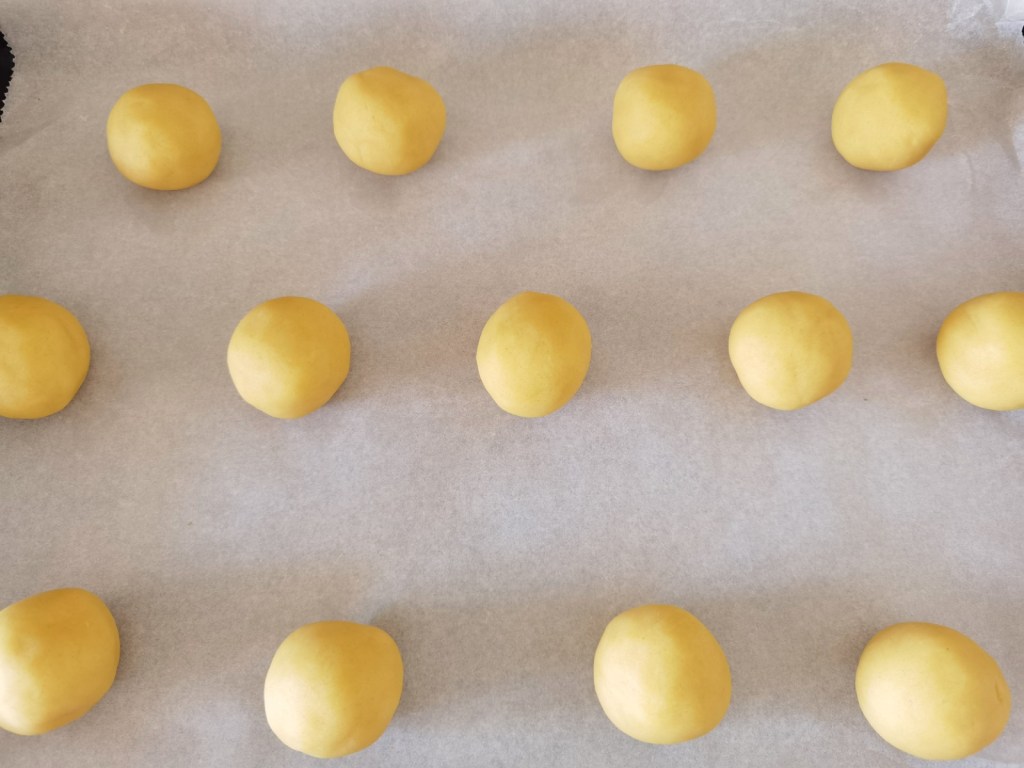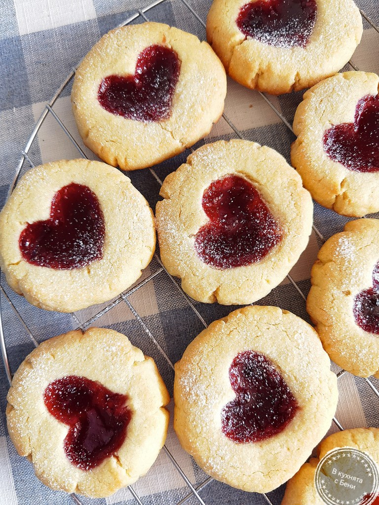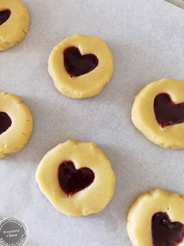 В купа сложих маслото, което бе със стайна температура, двата вида захар, ванилията и солта и ги разбърках за кратко с миксер. Добавих двата жълтъка и разбърках до поемането им от сместа. Брашното пресях и добавих постепенно, като в началото разбърквах с шпатула, а след това с ръце оформих топка от тесто. Не трябва да се меси, а по-скоро да се оформи еднородна смес. Увих тестото във фолио за свежо съхранение, като го притиснах във форма на диск, за да се охлади по-бързо. След 30 минути извадих тестото от фолиото и с ръце оформих топчета с тегло 40 грама. Мерих всяко топче на кухненската везна, но ако не разполагате с такава може да работите и „на око“. Диаметърът им бе 4 см. Готовите топчета разположих в тава, покрита с хартия за печене и всяко от тях притиснах с плоското дъно на канче, като целта е дебелината им да бъде около 5 мм. В този момент по края се разпукаха, но аз ги дооформих с пръсти. В средата на всяко кръгче натиснах два пъти с показалеца, за да се получи формата на сърце. В така оформената вдлъбнатина сложих по малко от сладкото.