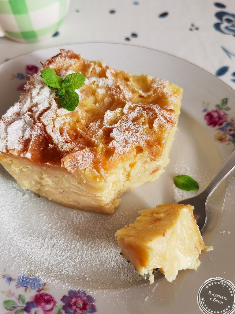 Готовата млечна баница оставих да се охлади напълно преди да отрежа първото парче. Съхранява се в хладилник. Сервирах, поръсена с пудра захар.
