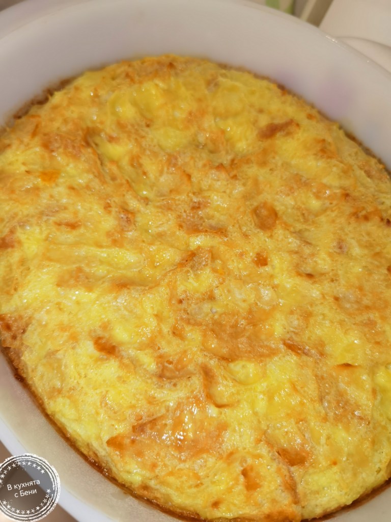 Млечната баница приготвих във форма от аркопал с размери 27х22х9 см. Ако я направите в по-голяма форма/тава, ще се получи по-ниска.