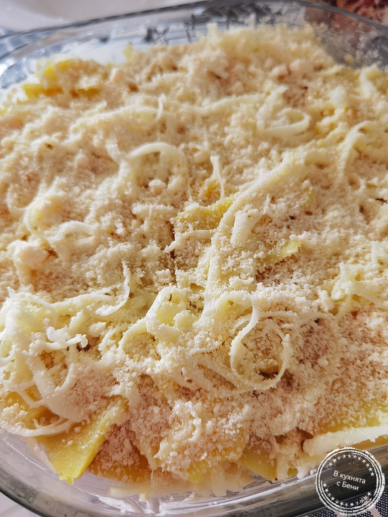 Форма с размер 23х23х6 см. намазах добре с меко масло. На дъното подредих нарязани на колелца картофи, с дебелина не повече от 3 мм. Посолих ги и отгоре им разпределих ¼ от кашкавала. Продължих с втори, трети и четвърти ред картофи и кашкавал, като завърших с последната ¼ от кашкавала. Залях с течната яйчено-млечна смес, поръсих с грана падано и сложих ястието да се пече в загрята на 180 градуса фурна за около 25-30 минути или до апетитен загар.