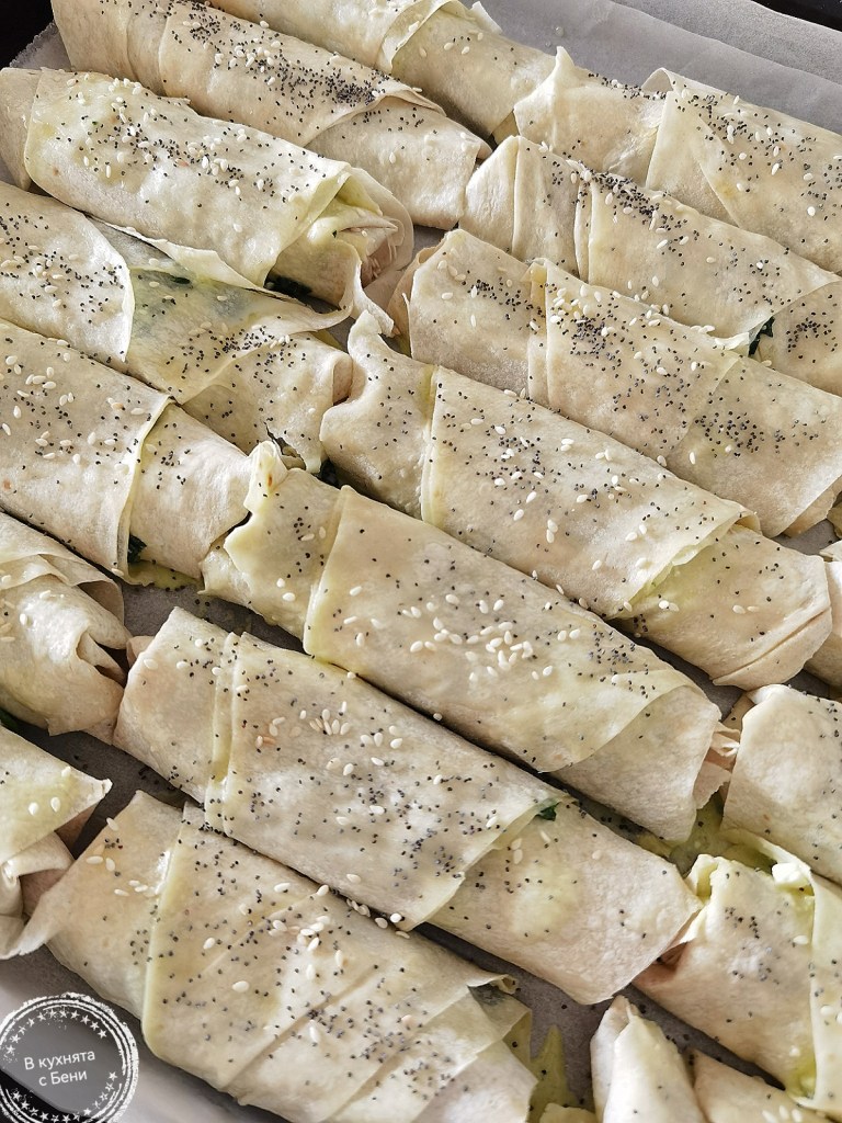 За всяка баничка ползвах два триъгълника, които сложих един върху друг. Върху горния разпределих около 2 с.л. от сместа, като я слагах предимно в широката част и леко нагоре. Не трябва да се слага твърде много, защото може да протече при навиването. Прегънах двете страни в широката част и навих руло, което прехвърлих в тавата. Надявам се от снимките да става ясно.