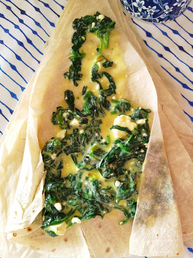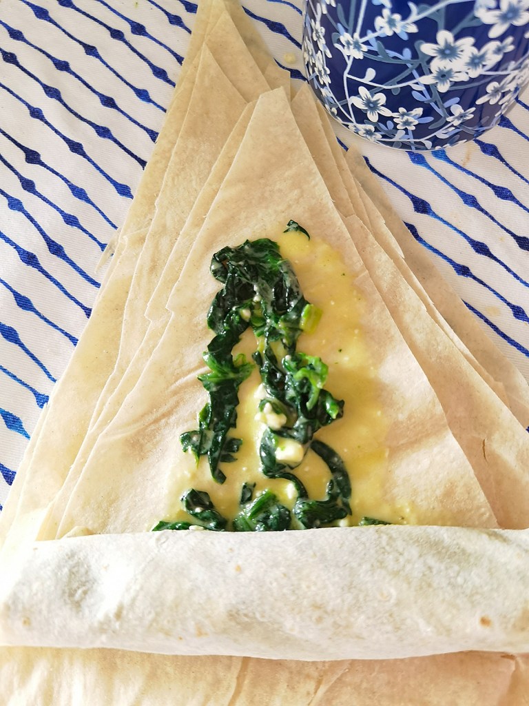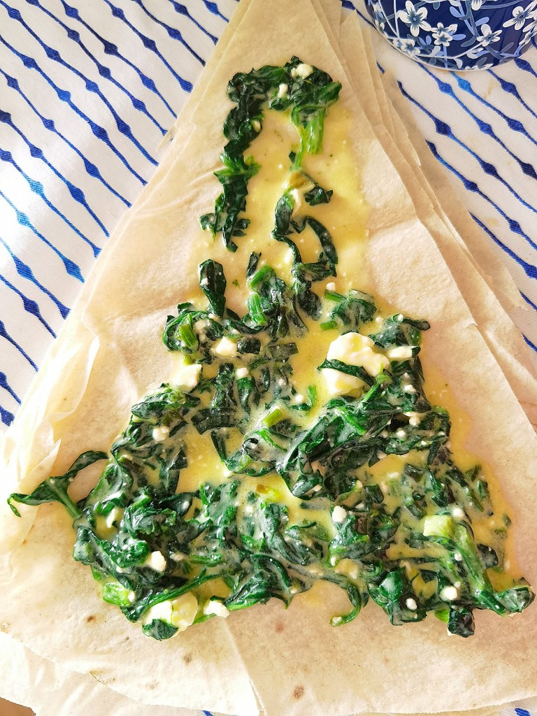 Спанака измих добре и отцедих, след което го нарязах на дребно. Лука нарязах също на дребно. В дълбок тиган загрях 1 с.л. масло и 1 с.л. олио и първо запържих лука, като леко го посолих, а след това постепенно добавих спанака и готвих, докато омекна, като също го посолих. Нужно е само да омекне, като в тигана остава течност, която после отцеждам. Готовия спанак оставих да се охлади. В метално канче разтопих 2 с.л. масло и 2 с.л. олио.