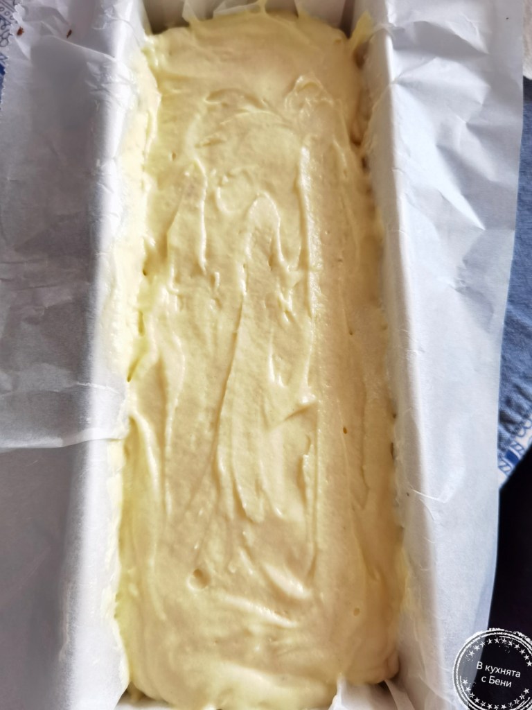 В голяма купа сложих мекото масло, пудрата захар и ванилията и с миксер ги разбърках за около минута или до кремообразна смес. Добавих жълтъците, като след всеки разбърквах за кратко. Към този момент сместа е доста гъста. Брашното пресях с бакпулвера и го добавих към сместа, редувайки с млякото и разбърквайки с кухненска бъркалка. На края добавих белтъците и разбърках внимателно, за да се усвоят от сместа, запазвайки въздушността си.