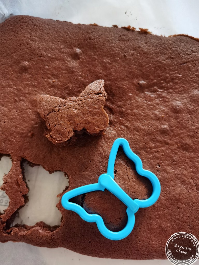 Форма за кекс с размер 30х11х7 см. покрих с хартия за печене, която леко намазах с масло. Фурната загрях на 170 градуса. С формичка на пеперуда изрязах какаовия блат и така оформените пеперуди подредих плътно една зад друга в кексовата форма. Около и върху тях разпределих светлата смес. Честно казано изпитах малка трудност със слагането на тестото от двете страни, но всъщност по време на печенето то се отпуска и уплътнява добре празните места и няма особено значение как го разпределяте.