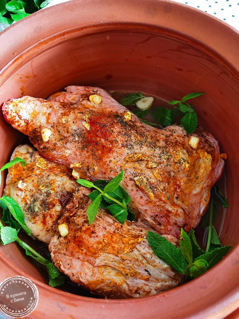 В малка купа смесих 5 с.л. олио, сухия джоджен, червения пипер, белия пипер, сол на вкус и 2 пресовани скилидки чесън. Измитото и подсушено месо намазах добре с тази смес. На места направих малки процепи, в които сложих нарязаните парченца оставали 3 скилидки чесън (шпиковах месото). Поставих месото в съд, покрит с фолио за свежо съхранение и прибрах в хладилника за през нощта. Ако не разполагате с толкова време, може да пропуснете този момент, но ако престои, месото става по-вкусно.