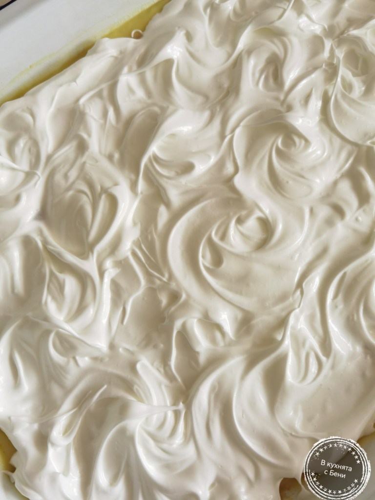 След това разбих белтъците с малката щипка сол и когато започнаха да се сгъстяват, добавих захарта. Разбих до гъст и лъскав крем, който разпределих върху десерта и направих леки флорални шарки. Фурната загрях само на горен реотан на 150 гр. Вдигнах металната скара на възможно най-горното ниво и поставих тавата с десерта в напълно загрятата фурна. Нужни бях 11-12 минути, за да се запекат белтъците, без да стават твърде тъмни. Всяка печка пече различно, така че е възможно при вас да са нужни е още няколко минути.