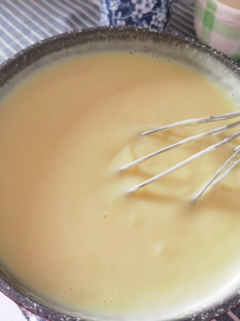 През това време приготвих крема, като в малка тенджера загрях 950 мл. от предвиденото мляко, в което добавих захарта и ванилията. Яйцата разделих на жълтъци и белтъци. Жълтъците сложих в подходящ съд и ги разбърках с кухненска бъркалка. Започнах да добавям от останалите 250 мл. мляко и от брашното редувайки ги и разбърквайки постоянно с кухненска бъркалка, за да не се получат бучици. Когато млякото завря, отстраних съда от котлона и при постоянно разбъркване добавих яйчната смес. Върнах на котлона и варих, разбърквайки, докато кремът завря и около 20 секунди след това. С горещия крем залях леко охладената юфка и разбърках добре. Оставих да изстине почни напълно на стайна температура, за да може юфката да поеме от крема и да омекне.