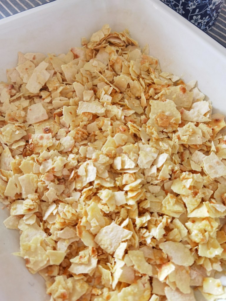 В тава с размер 34х27х5 см. изсипах домашната юфка и я полях със загрятото в метално канче масло. Разбърках добре и сложих да се запече в загрята на 170 гр. фурна за около 10-ина минути или до съвсем лек загар. След това извадих тавата и оставих юфката да се охлади.