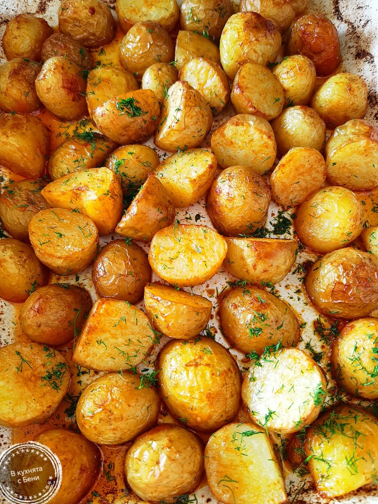 📌Добре е тавата да бъде голяма, за да се разпределят картофите равномерно по дъното и да се изпекат по-добре.