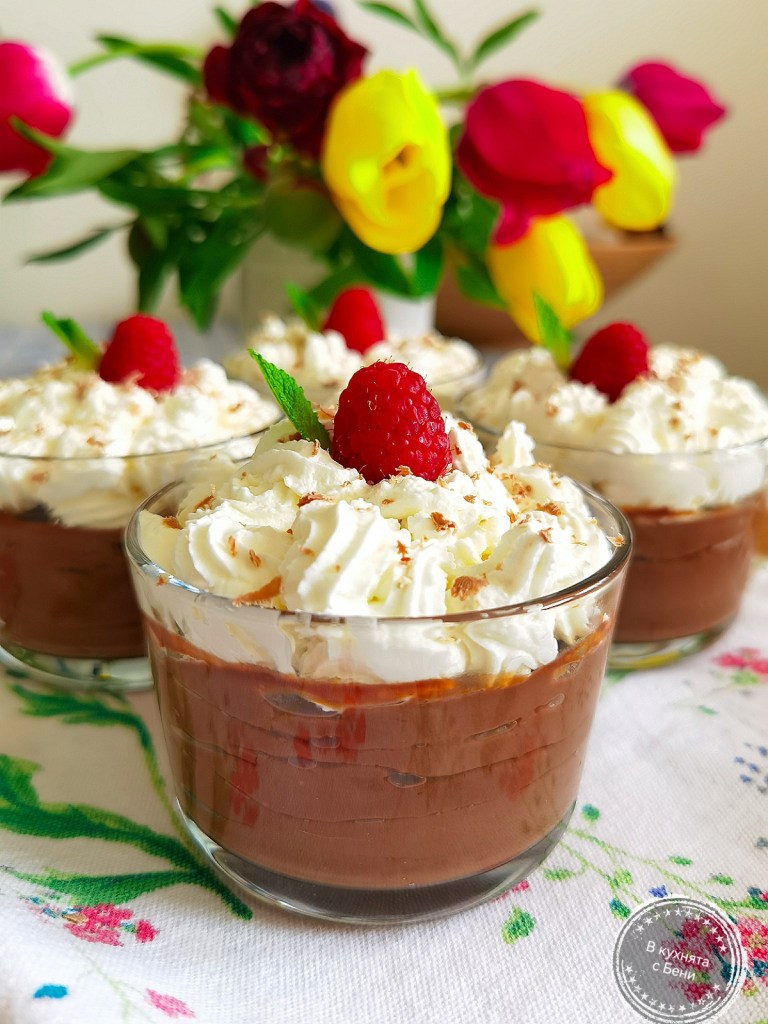 В дълбок съд сложих добре изстудената течна сметана, пудрата захар и маскарпонето и с миксер ги разбих на гъст крем, което отне около 3 минути. В началото сместа е доста течна и леко пръска, но след 2-рата минута започва да се сгъстява. С помощта на шприц разпределих крема в четирите чаши и прибрах за 20-ина минути в хладилника. След това украсих с настърган шоколад, малина и листенце мента. Сервирах с усмивка!