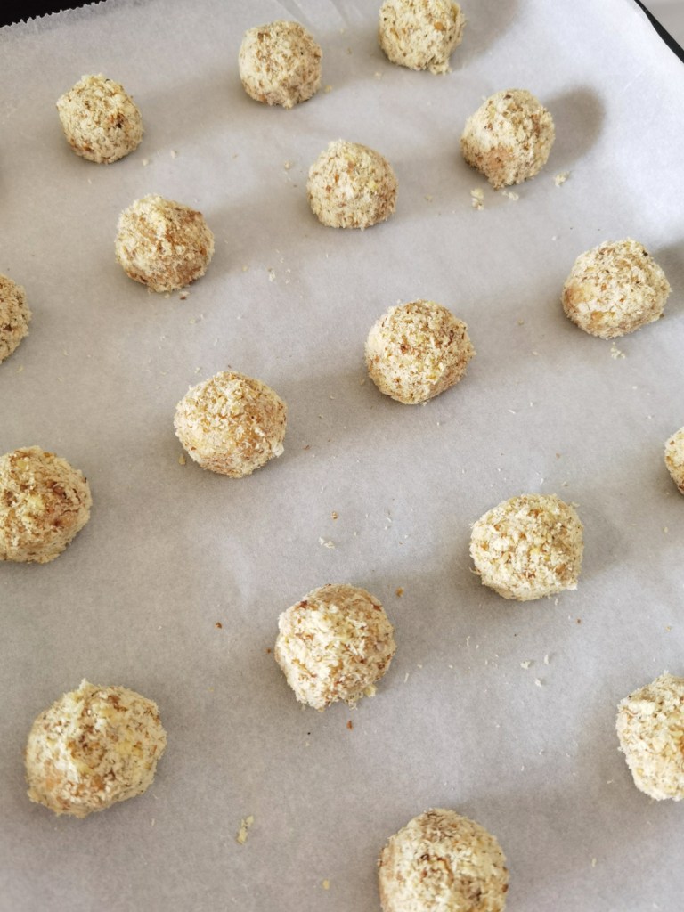 Фурната загрях на 190 градуса. Тавата на фурната покрих с хартия за печене. Орехите смлях на едро. От сместа загребвах с чаена лъжичка и с длани оформях 18 малки топчета, които овалвах в орехите и разполагах на разстояние едно от друго, защото по време на печене се отпускат. Пекох ги около 10-12 минути до приятен загар, без да ги препичам.