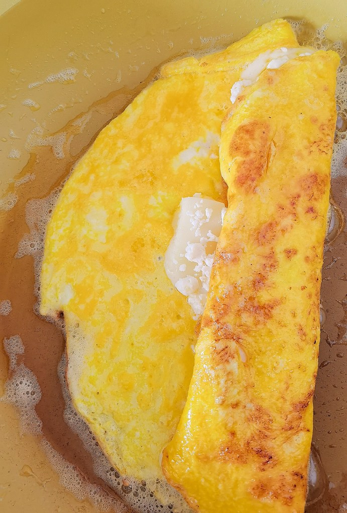 Тиган с диаметър в долната част 22 см. загрях на 5 от 6 степени на моята печка и добавих маслото и капките олио. Тях слагам, за да не прегори маслото. Когато мазнината се сгорещи, изсипах яйцата и ги разпределих равномерно. Когато сместа видимо започна да се стяга поставих тънко нарязания кашкавал и сиренето. С две шпатули подхванах омлета и внимателно го прехлупих на два пъти, за да се получи руло. Пържих го още минута на вече изключен котлон.