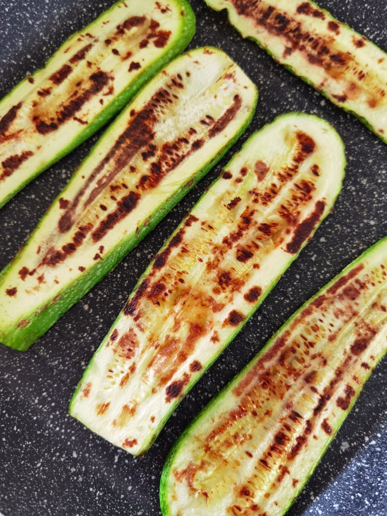 Грил тигана загрях на котлона, който бях включила на 5 от 6 на моята печка. С четка леко го намазах с масло и подредих първите филийки тиквички. Трябва да се пекат, а не да се пържат. Тигана намазвам с масло само в началото, преди първите тиквички. Изпекох ги до апетитен загар и омекване, като готовите подреждах в чиния и леко посолявах.