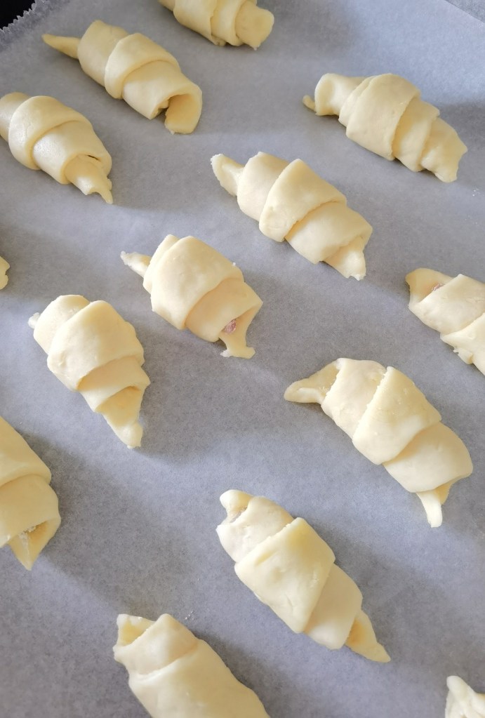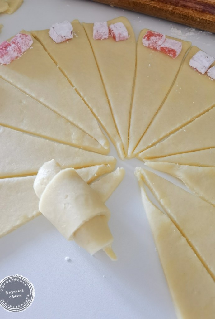 Взех първото охладено тесто и върху леко набрашнен плот го разточих на тънка платка с дебелина не повече от 3 мм. В широката част сложих по 1-2 парченца локум, спрямо големината им и навих на руло, което поставих в тавата на фурната, която предварително покрих с хартия за печене. По този начин приготвих и останалите и продължих с втората топка тесто.