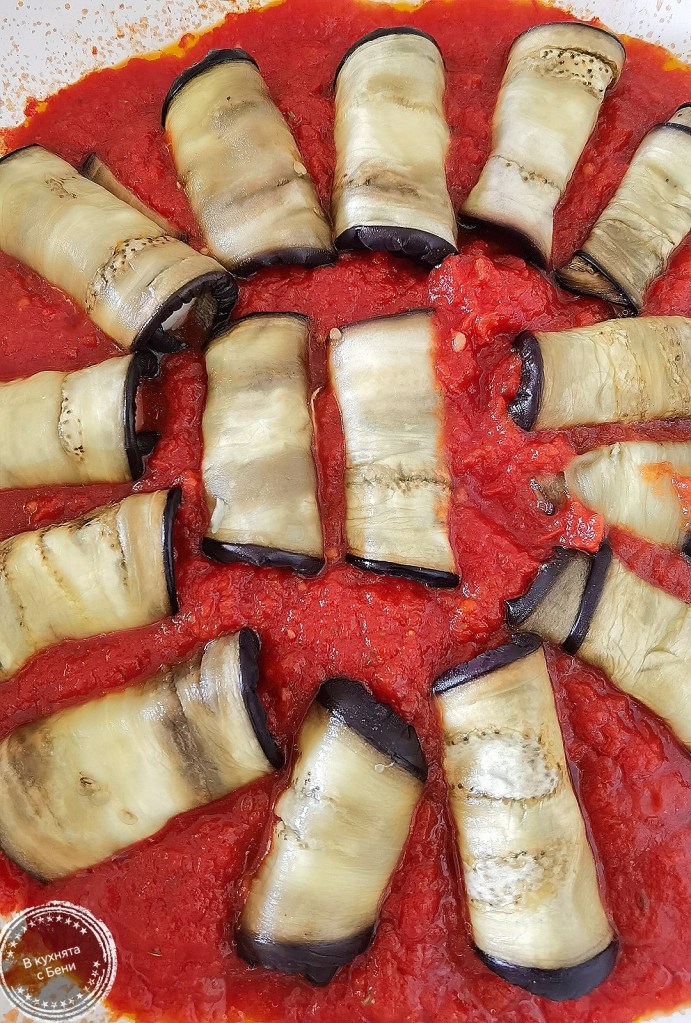 В широк тиган, който разполага с капак загрях 3 с.л. олио и добавих пресованите скилидки чесън. Разбърках ги и след около 20-ина секунди прибавих смлените домати, леко посолих и поръсих с ригана. Сложих капака и намалих степента на котлона на 4 от 6 на моята печка. След 8-10 минути, отстраних тигана от котлона и подредих патладжанените рула. С лъжица ги полях със сос, сложих капака върху тигана и готвих около 5 минути, след което поръсих равномерно с настъргания кашкавал, отново сложих капака и готвих още около 5 минути или до разтопяване на кашкавала.