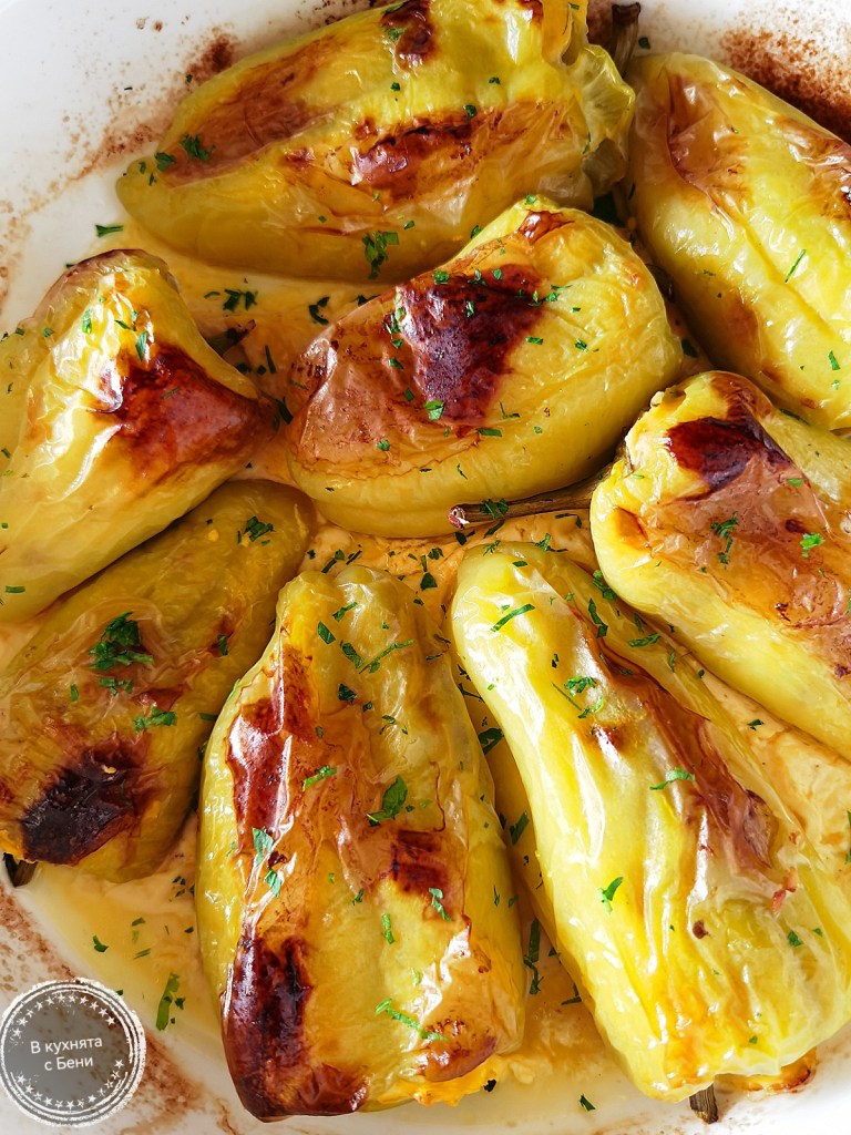 Сложих тавата в леко загрята фурна и увеличих степента на 190 градуса. Моята форма е от аркопал и трябва да се загрява постепенно. Ако ползвате метална, сложите тавата в напълно загрята фурна. Така ще спестите от времето за готовност на чушките. Пекох около 25 минути и след като чушките видимо се запекоха отгоре, ги обърнах и пекох още около 20-ина минута или до апетитен загар.