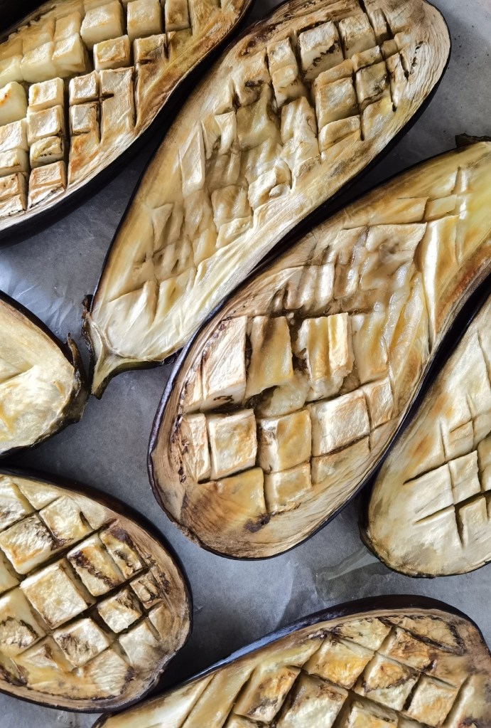 Междувременно загрях фурната на 200 градуса. Голямата тава на фурната покрих с хартия за печене и разположих патладжаните, като ги посолих и покапах със зехтин/олио. Пекох ги за около 30 минути или до пълно омекване на месестата им част.