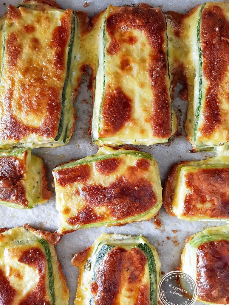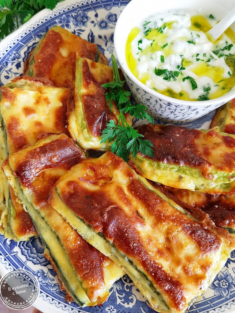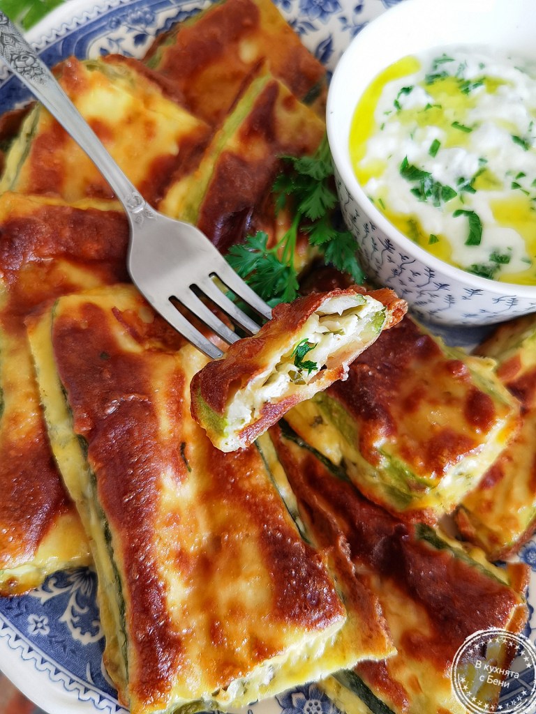 Тиквичките измих, подсуших и нарязах на филии с дебелина не повече от 0.5 см. Понеже бяха големи, първо разрязах тиквичките на две. Посолих ги и оставих в чиния да си пуснат водата, което отне около 30 минути. След това ги изплакнах и подсуших много добре с домакинска хартия. Старах се да групирам по размер филийките тиквички, за да се получат по-хубави като форма бюреци.
