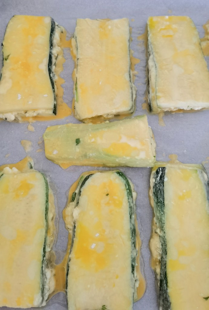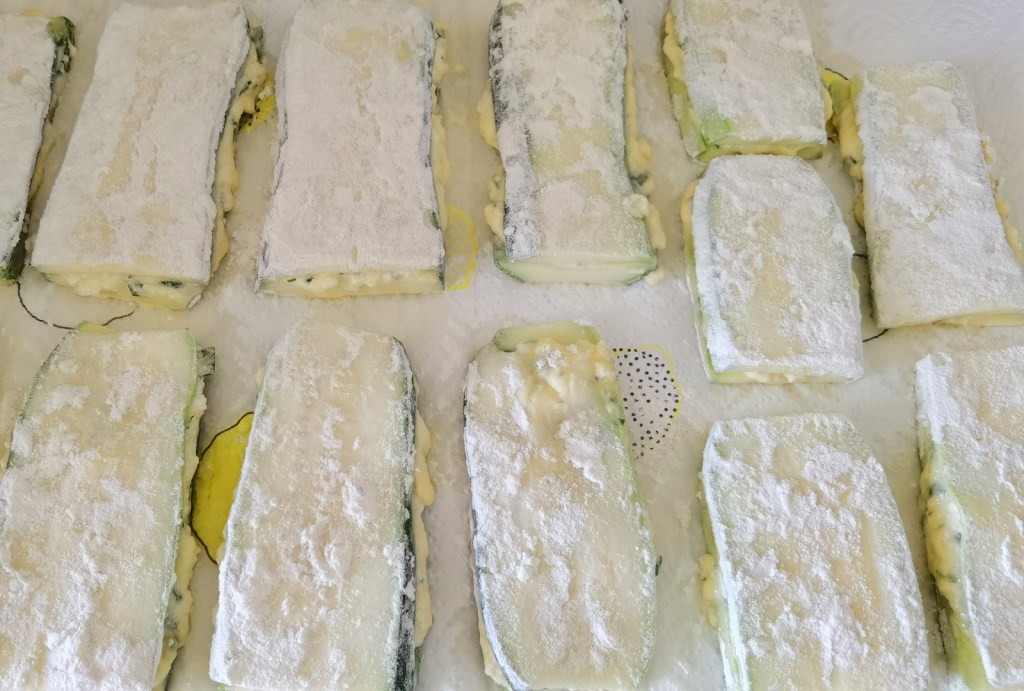И така, взех една филийка тиквичка и сложих малко от плънката, като я разпределих равномерно. Покрих с друга филийка тиквичка и без да притискам много, така получения сандвич овалях добре в брашното и сложих върху подготвената домакинска хартия. По този начин приготвих всички. Не слагайте много плънка, защото ще изтече.