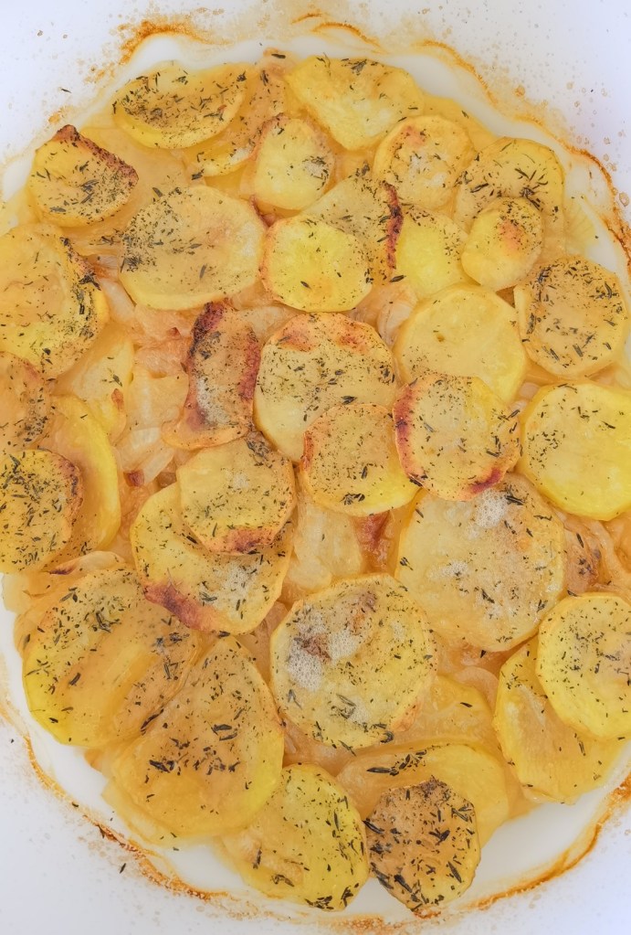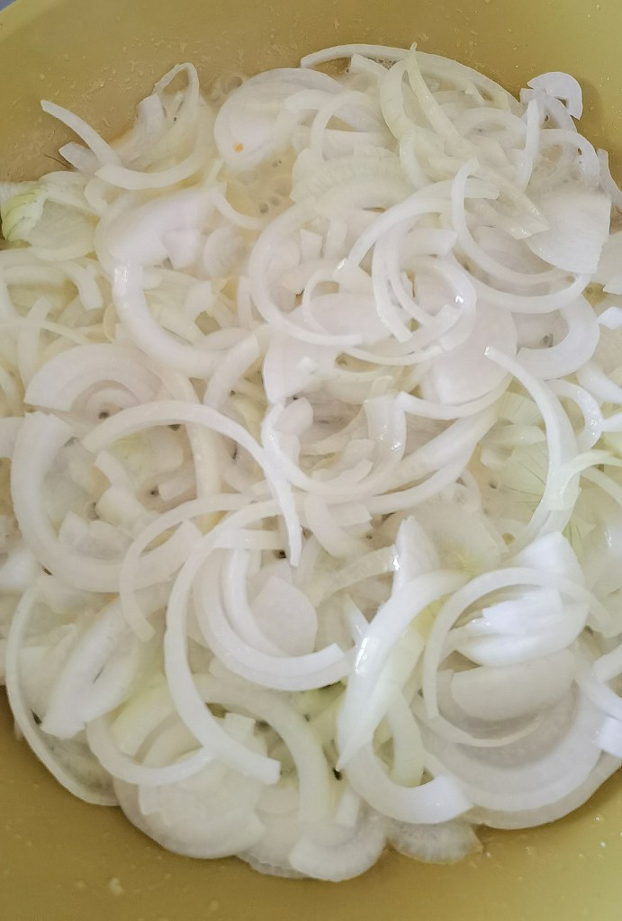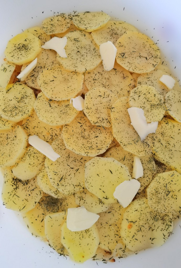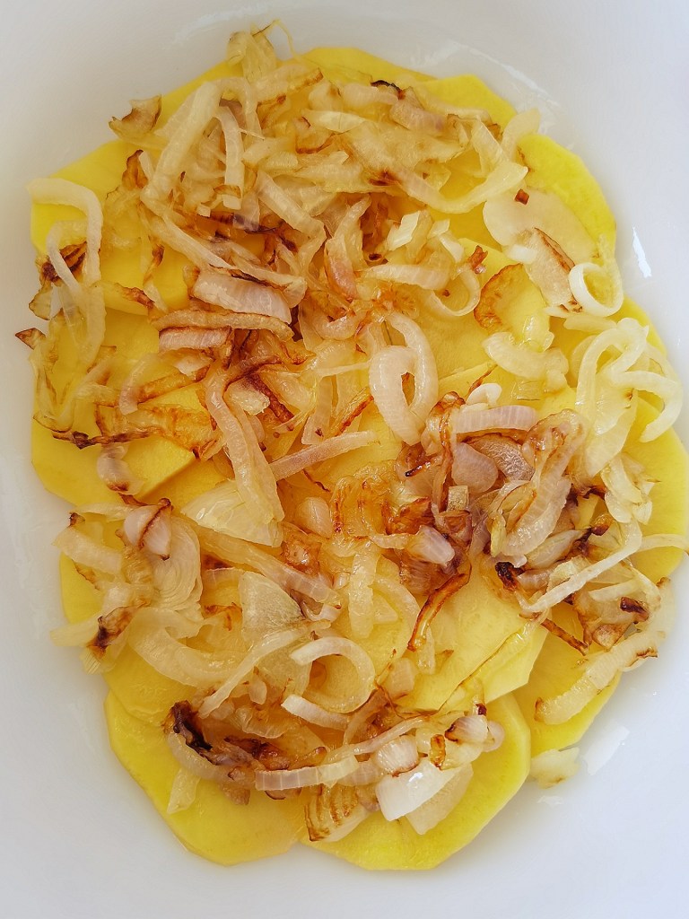 През това време обелих картофите, измих ги и нарязах на шайби с дебелина не повече от 3 мм. В касерола загрях 430 мл. вода и добавих сухия бульон. Варих 1 минута и отстраних от котлона. Дъното и стените на форма за печене с размер 26х20 см. намазах с масло. Подредих 1/3-та от картофите, като ги застъпвах. Върху тях разпределих половината лук и сложих втори ред картофи, след което продължих с останалия лук и завърших с последните картофи.