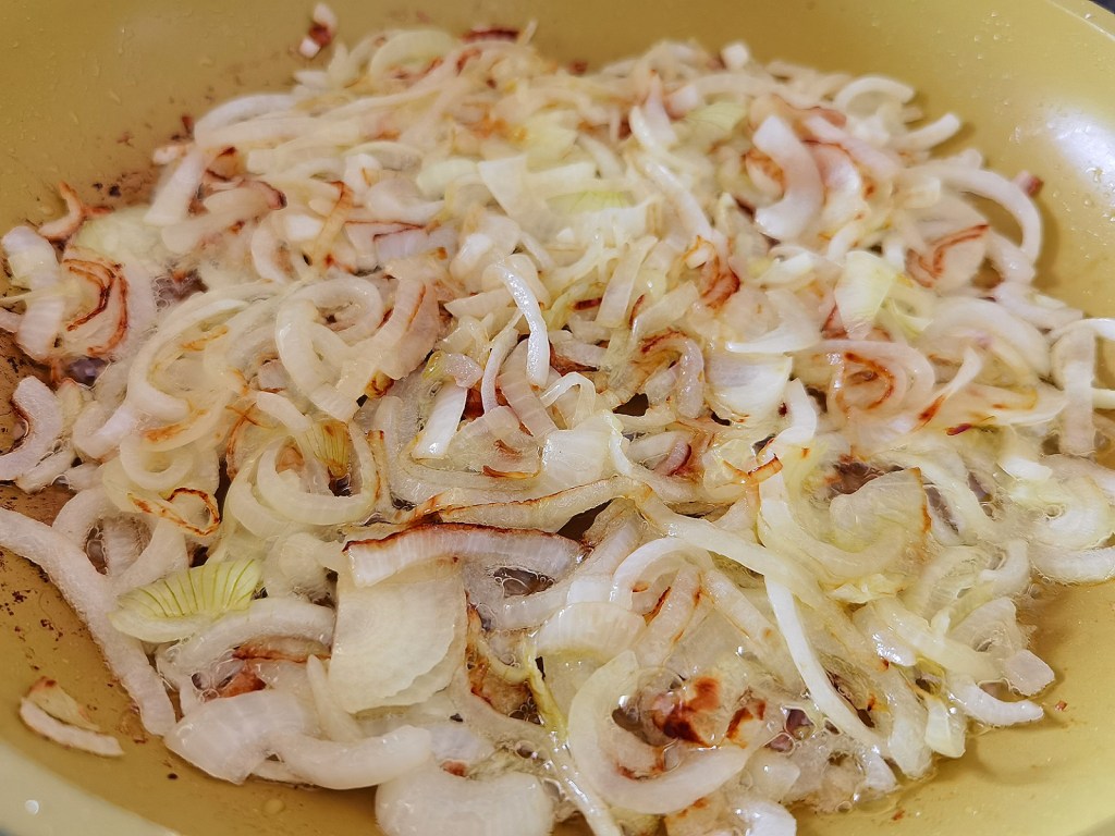 Лука нарязах на тънки полумесеци с дебелина около 2-3 мм. В тиган загрях маслото и олиото, сложих лука, посолих го и готвих на 5 от 6 степени на моята печка до леко карамелизиране и златист загар.