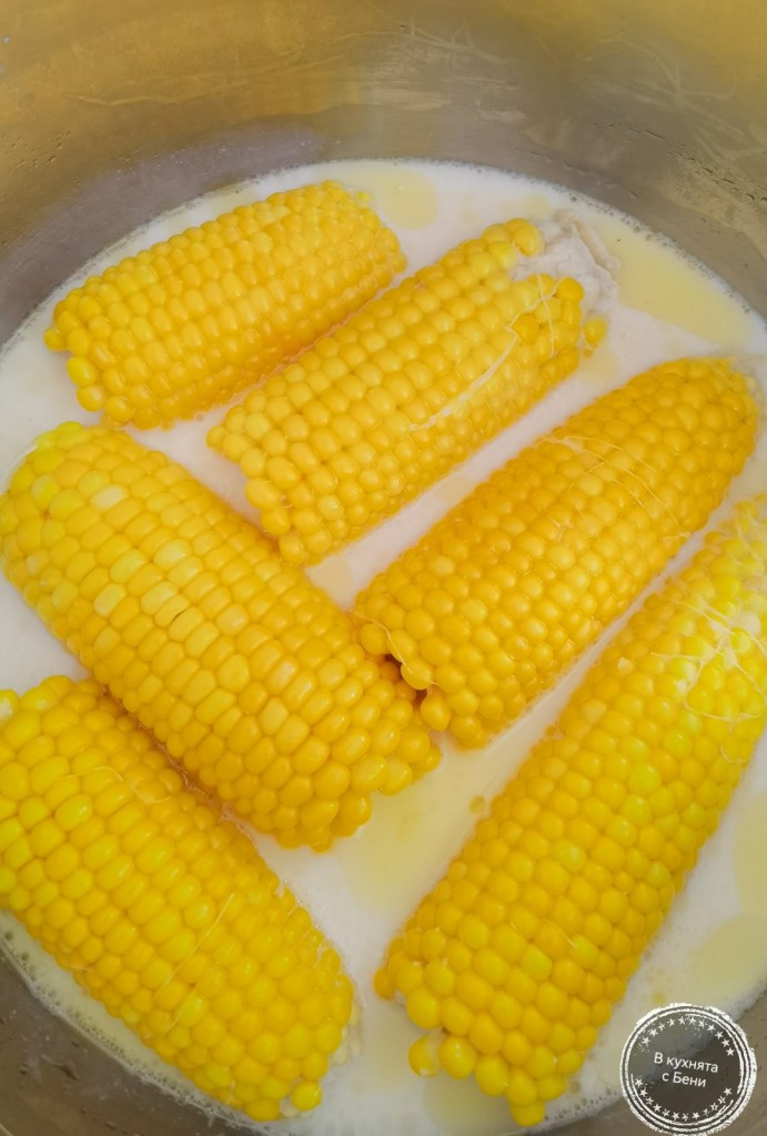 🌽Царевицата почистих, начупих на две, сложих в голяма тенджера и налях вода, която добре да я покрива, както добавих 1 ч.ч. (250 мл.) прясно мляко и 2 с.л. масло. Варих до омекване на царевицата. Сервирах я намазана с още малко масло и поръсена със сол на вкус.