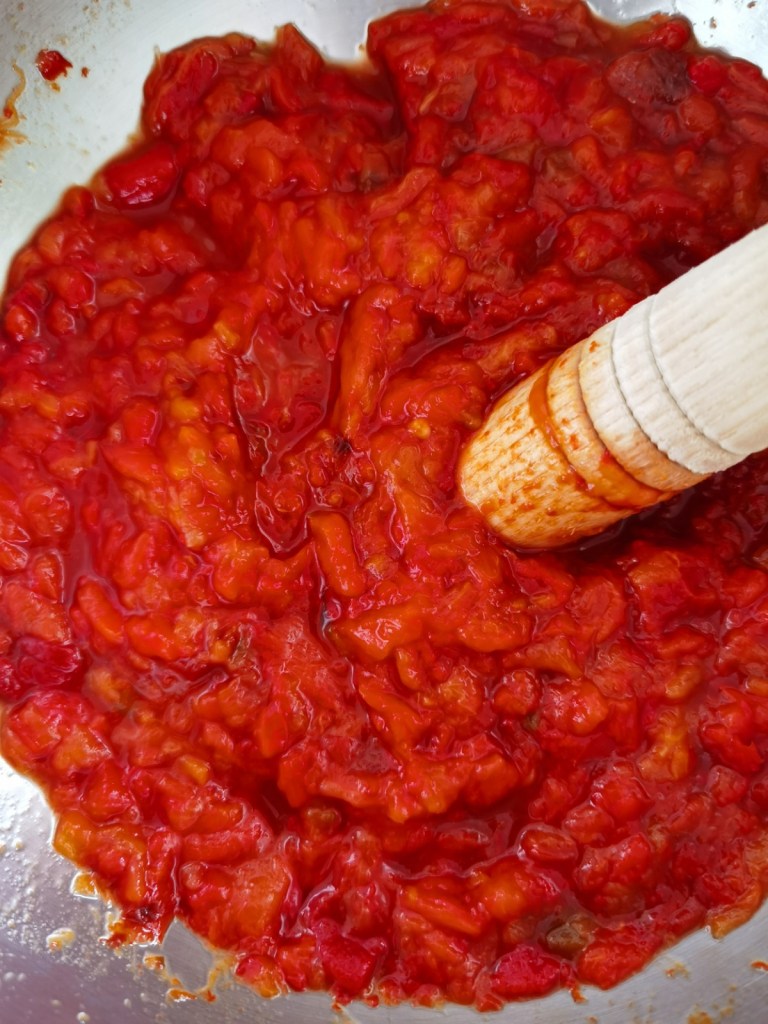 След като изстинаха, ги обелих и поставих в гевгир, за да се отцедят от евентуалната течност, която биха пуснали. След това ги нарязах на дребно и прехвърлих в купа. Имам само малко хаванче, в което нямаше да се побере това количество чушки и затова ги сложих в купа, а за счукването им използвах дървеното му чукче. И така, счуках чушките за около пет минути, като целя да има и по-едри парченца, а не да се превърнат в пюре.
