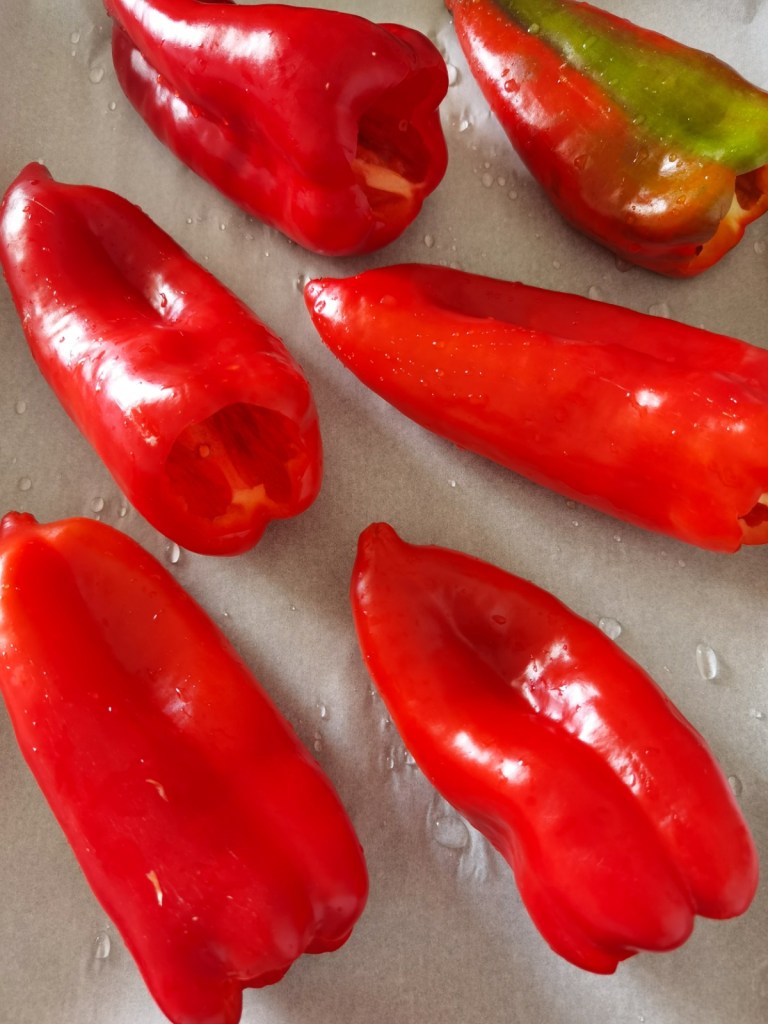Чушките измих и премахнах капачетата и семената им. Подредих ги в тава, покрита с хартия за печене и ги сложих в загрята на 220 градуса фурна за около 30 минути или до изпичане. Веднага ги прехвърлих в тенджера, която покрих с фолио за свежо съхранение, за да се задушат и да се обелят по-лесно.