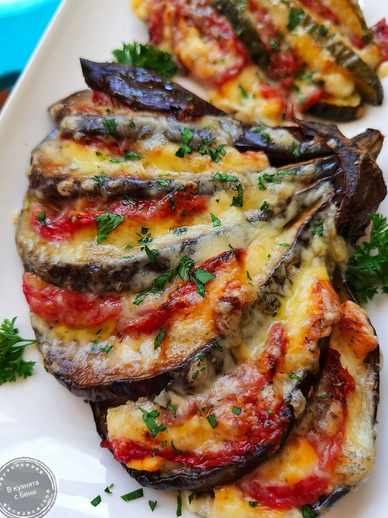 Фурната загрях на 200 градуса. Голяма тава покрих с хартия за печене, която леко намазах с олио. Тиквичките измих, подсуших и внимателно разрязах по подобие на патладжана. Разположих и двата зеленчука в тавата и ги посолих и леко покапах с олио. Пекох ги около 20 минути или до омекване. За целта пробвах с дървено шишче, което с лекота преминаваше през тях.