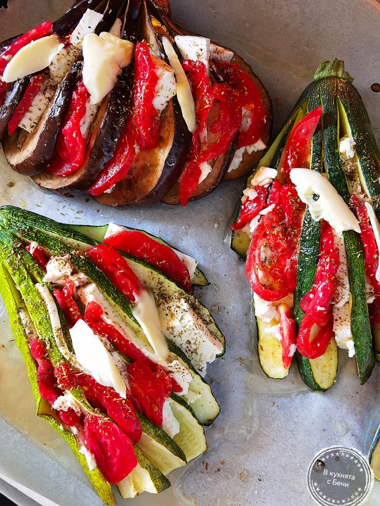 Извадих тавата с омекналите зеленчуци и внимателно разположих в прорезите им сирене и домат, след което ги поръсих с риган и сложих по парченце масло върху тях.