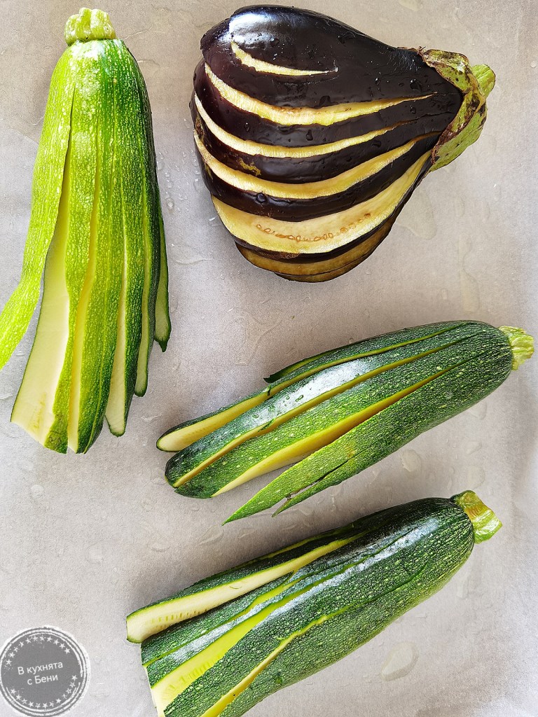 Първо подготвих патладжана, като го разрязах внимателно по дължина, без да стигам до края. Всъщност разрязването му и това на тиквичките е моментът, който изисква най-много прецизност. Посолих в прорезите и оставих за около 30 минути или повече, за да си пусне горчивия сок. След това го измих и подсуших.