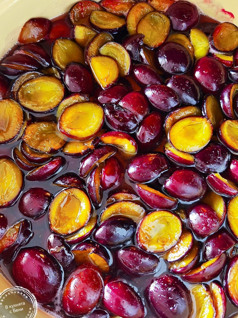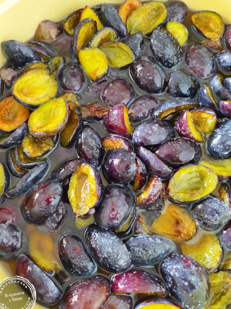 Сливите измих, почистих от костилките и разположих в голяма и дълбока тава с диаметър 34 см. и височина 7 см. Поръсих ги със захарта, разбърках, покрих формата с фолио за свежо съхранение и прибрах в хладилника за през нощта.