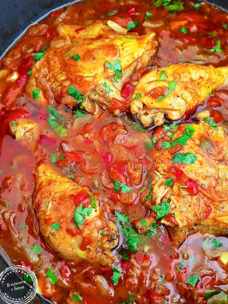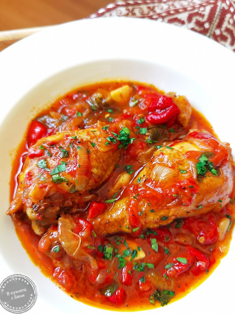 Когато омекна и доби златист загар, добавих нарязаните на ивици печени чушки и след 2-3 минути поръсих с чубрицата и добавих нарязания на колелца скилидки чесън. След минута прибавих доматеното пюре, червения пипер и обеления и нарязания на дребно домат. Разбърках и след още една минута върнах пилешкото, полях с 2 и ½ ч.ч. гореща вода (1 ч.ч.=250 мл.), посолих още малко и готвих под капак на слаба степен на котлона – 3 от 6 на моята печка. Нужно бе около 1 час, за да омекне напълно месото и сосът се редуцира. По време на готвенето на два пъти обърнах месото.