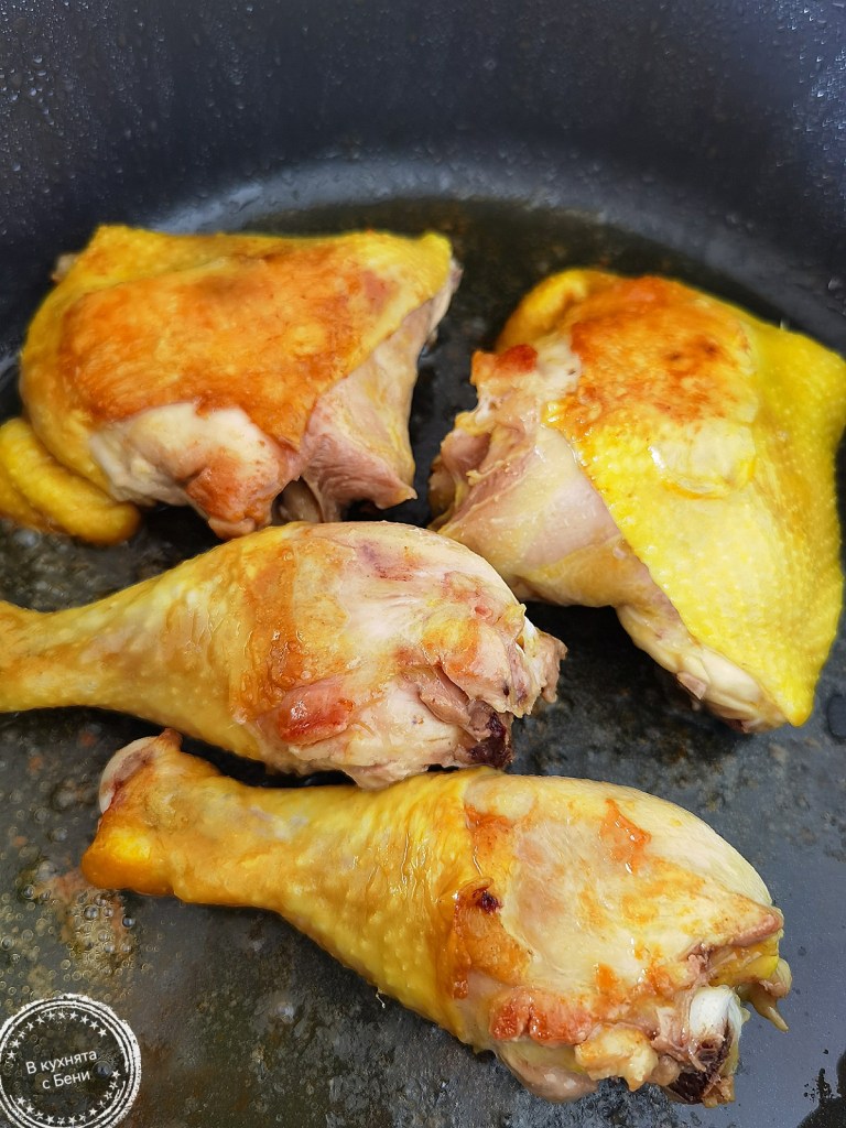 Пилешкото измих, подсуших и поръсих със сол и бял пипер. В съда за готвене загрях 2 с.л. олио и 1 с.л. масло и изпържих порциите месо от двете страни до апетитен загар. Съдът, който ползвам е масивен, широк и дълбок и разполага с капак, който ползвах за приготвяне на ястието. Изпърженото месо преместих в чиния, а в съда сложих нарязания на полумесеци лук и ги посолих.