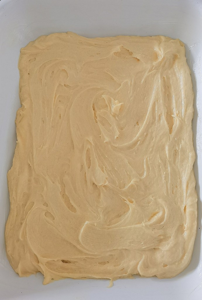 В купа сложих мекото масло и започнах да го разбивам на крем, използвайки миксер, като след половин минута добавих захарта, солта и ванилията. Разбивах още три минути, след което прибавих едно по едно двете цели яйца и двата жълтъка и разбърках до гладка смес. Добавих пресятото брашно, като вече разбърквах с кухненска бъркалка. Сместа е много по-гъсто от обичайното кексово тесто. Фурната загрях на 170 градуса. Дъното и стените на форма за печене с размер 28х22 см. намазах добре с масло и изсипах блата. Загладих го равномерно.