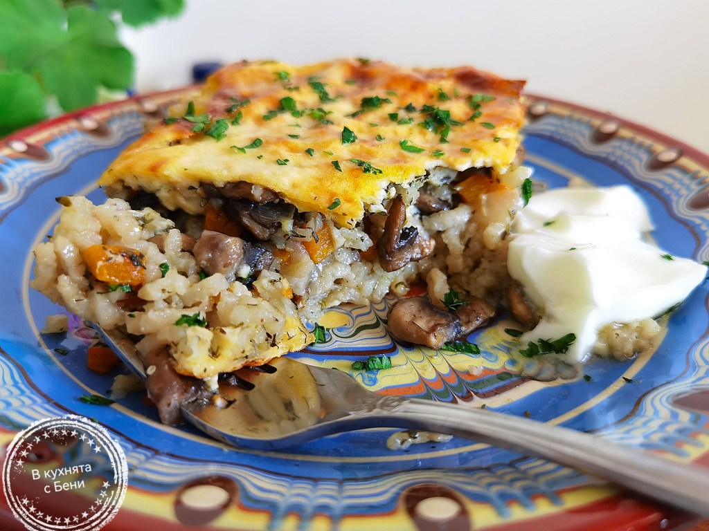 Изсипах сместа от тигана в тава с диаметър 30 см. Полях с горещата вода, разбърках и отгоре сложих няколко парченца масло. Сложих ястието да се пече в загрята на 190 градуса фурна, до поемане н течността. 10-ина минути, след като започна да се пече, го разбърках, за да се разпределят гъбите равномерно и да не останат на дъното.