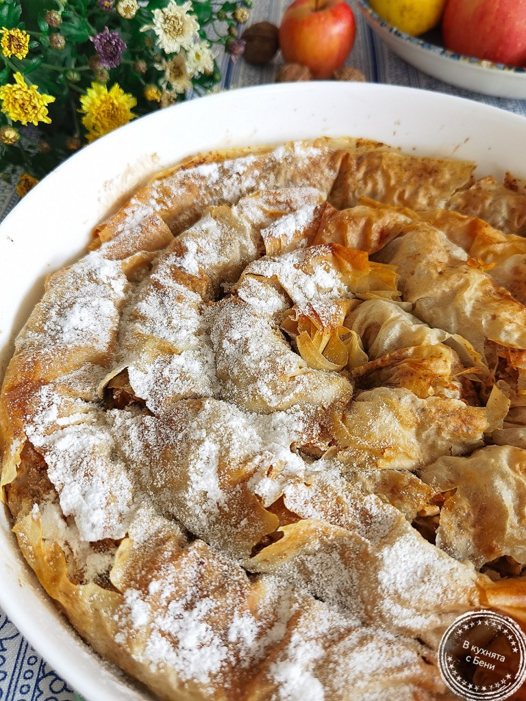 Десертът в неделния следобед у дома е вкусен щрудел, който приготвих по малко по-различен начин, който прави орехите в него добре изпечени и така общия вкус е още по-добър. Ябълките бяха сладки и ароматни и в кухнята се носи чуден аромат на есен и домашен уют.😋🍏🍎🥧👌😍