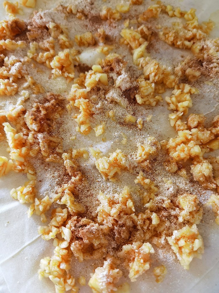За направата на щрудела използвах ябълки Флорина и Златна превъзходна, които купувам от човек, който ги бере от градината си. Обелих ги и нарязах на големи парчета, които накълцах на дребно с помощта на кухненския робот. Използвах купата със стандартната приставка за рязане, като бяха нужни не повече от 8-10 секунди, за да се накълцат, без да станат на пюре. Не ги предпочитам настъргани, защото пускат сок, а така нарязани на дребно, той си остава в ябълките и щруделът става по-вкусен.