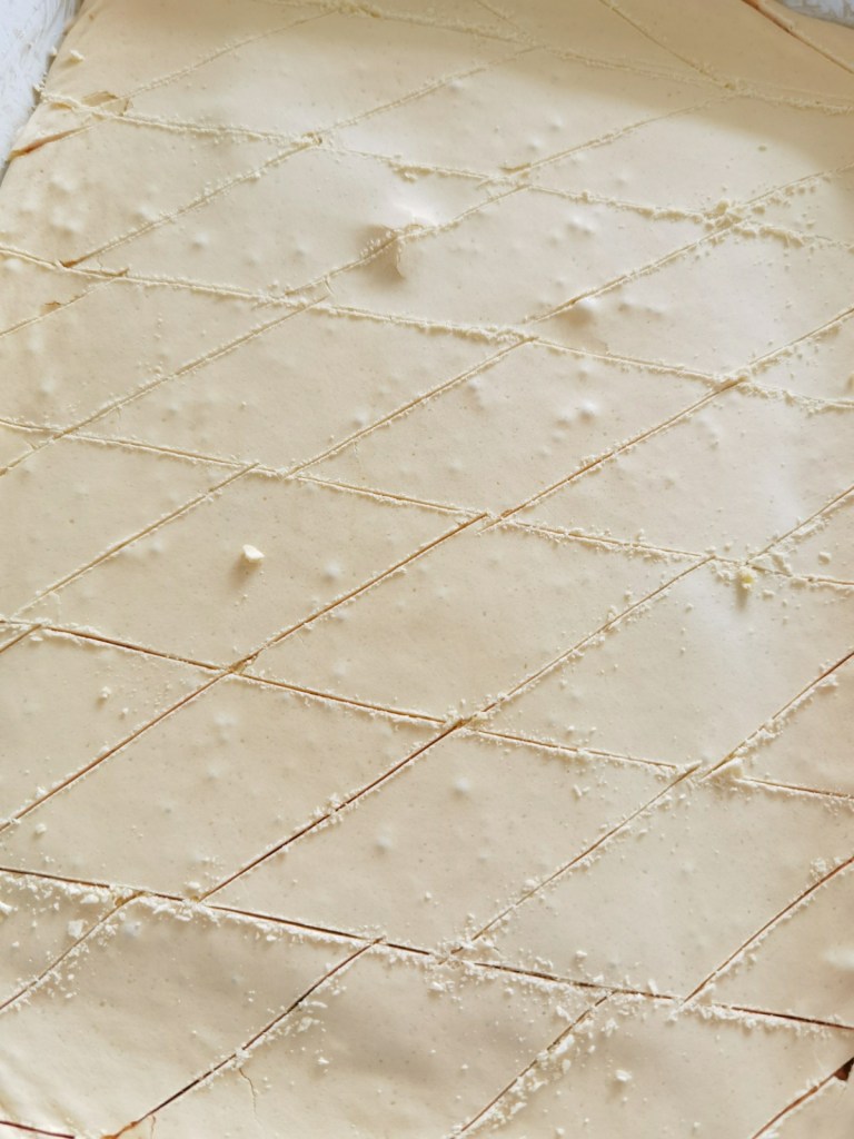 За да го нарежа на по-правилни и ненапукани парченца, около 10 минути, след като го извадих от фурната, направих повърхностни разрези, които може да видите на снимката. За целта използвах къдравия нож за хляб, който винаги ми се е струвал най-остър. Когато сладкишът изстина напълно, го нарязах следвайки разрезите, като винаги има риск някои парченца леко да се напукат.