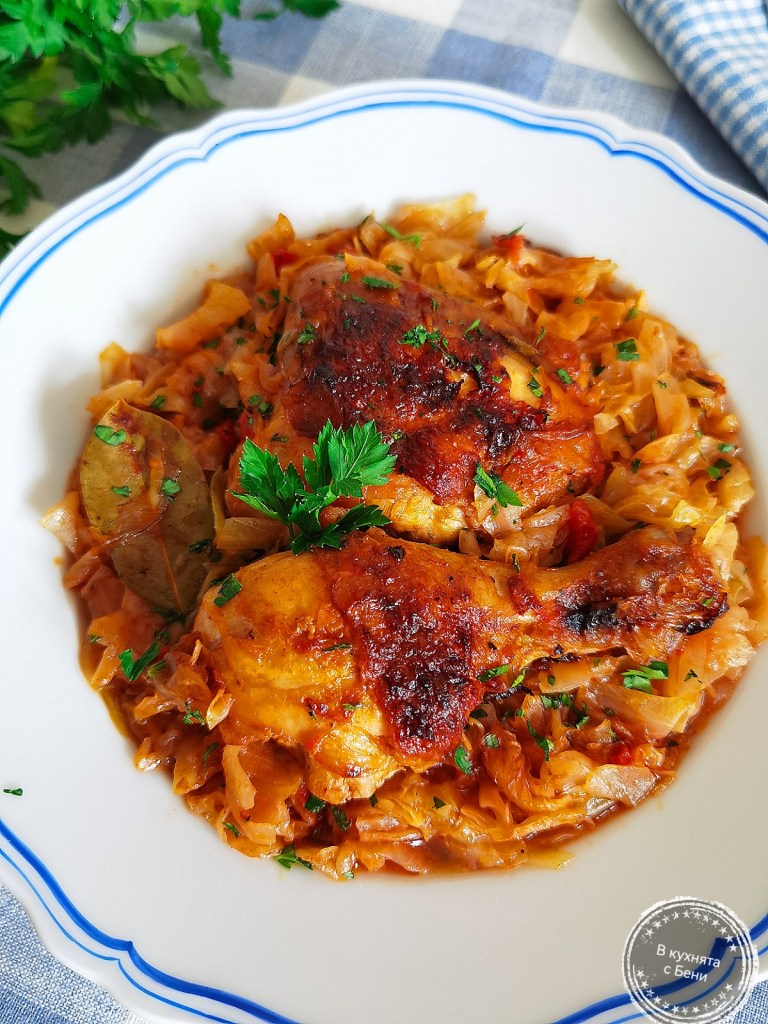 В широка и дълбока тенджера загрях 4-5 с.л. олио и запържих бутчетата до хубав загар от двете страни. Ако тенджерата е по-малка, ще се наложи да ги запържите на два пъти. Извадих ги в чиния и в същата тенджера сложих част от зелето, като добавях постепенно и останалото, поливайки с по още малко олио, докато цялото зеле бе поето и започна да омеква. Поръсих с червения и мления пипер меланж и разбърках. След това добавих нарязаните на дребно обелени домати от консерва и течността, в която бяха. Разбърках и готвих около 5 минути.