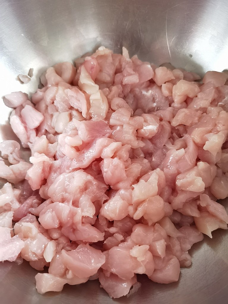 Пилешките бон филета измих, подсуших с домакинска хартия и нарязах на съвсем малки парченца с размер не по-голям от 1х1 см. Сложих ги в купа, посолих и разбърках. Добавих яйцето, майонезата, чесъна, нишестето, мления пипер, настъргания кашкавал и нарязаната на дребно листна част на магданоза. Разбърках добре.