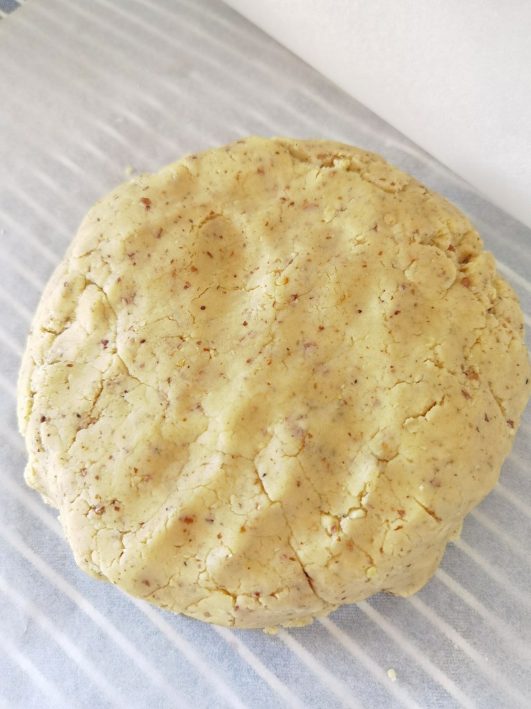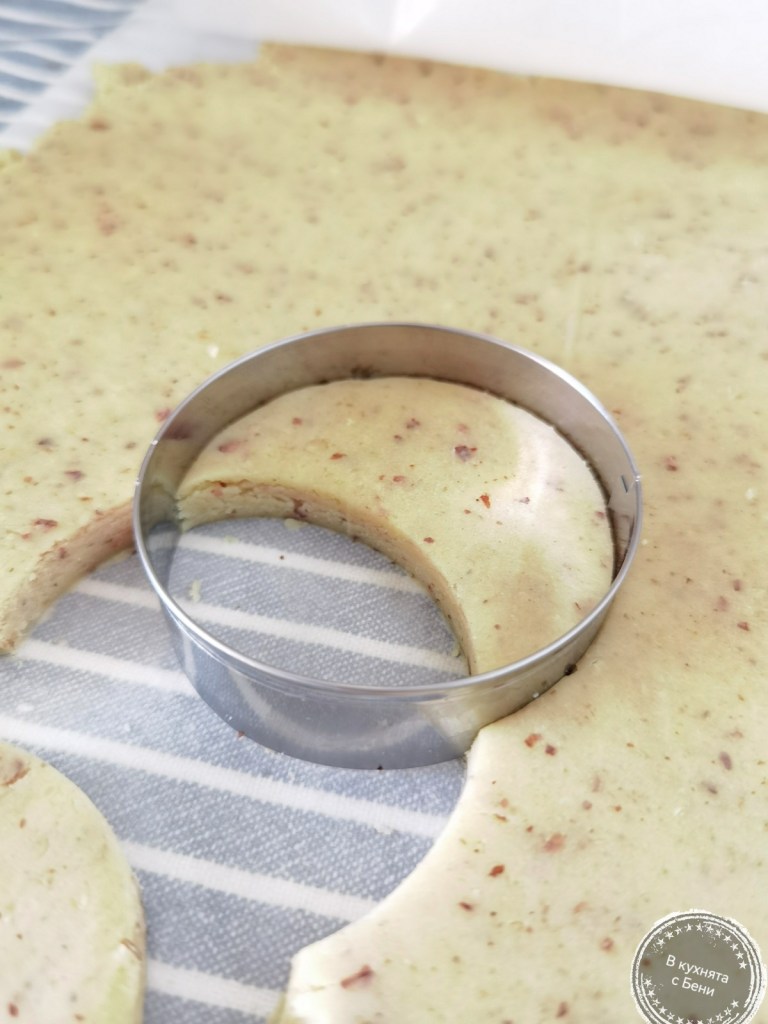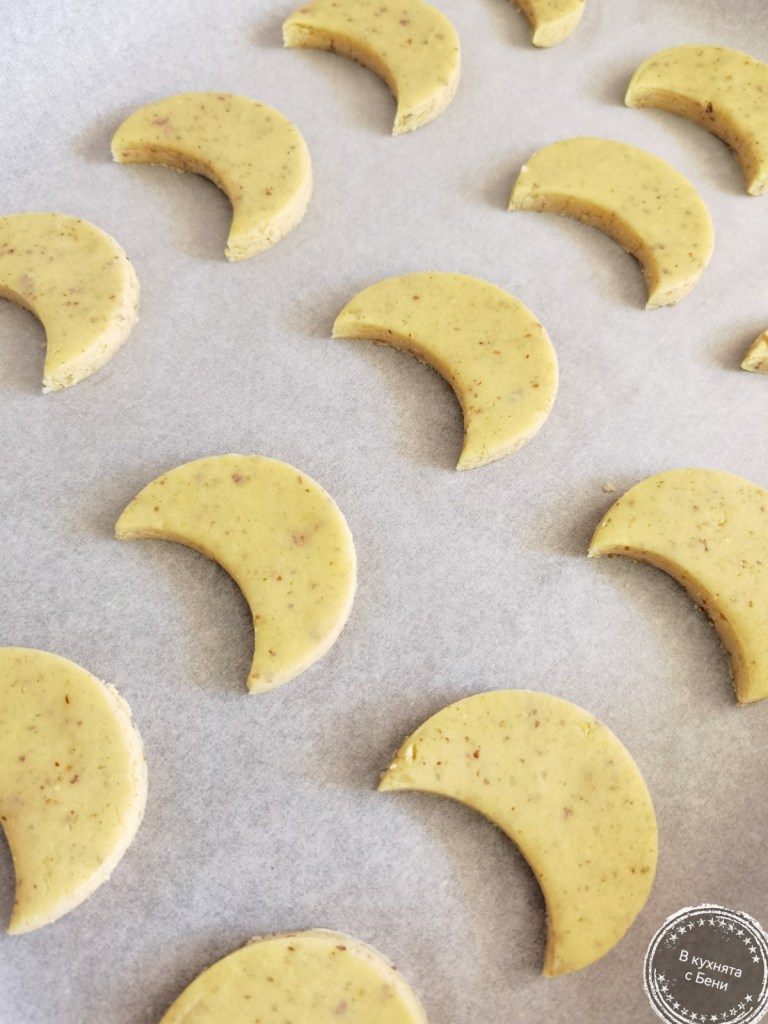 Брашното пресях с бакпулвера и го добавих към сместа, разбърквайки с шпатула. Когато бе усвоено, прибавих смлените орехи и разбърках финално. Тестото е ронливо и нехомогенно. С ръце започнах да го притискам, докато се събра на топка, която сложих върху голям лист хартия за печене. Отгоре покрих с втори лист и с дебела точилка внимателно разточих блат с дебелина 1 см. Отлепих хартията и с ринг с диаметър 6,5 см. изрязах полумесеци, които разположих в тава, покрита с хартия за печене.